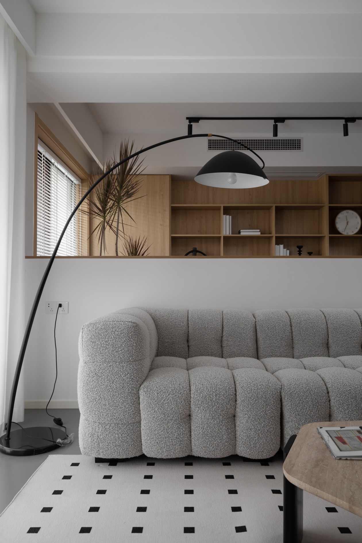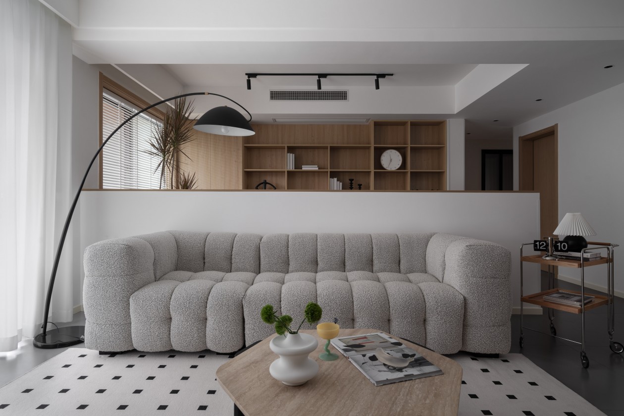 整面浅木色柜体藏起电视和杂物,把空间衬得温暖又整洁;米灰色沙发带着软乎乎的褶皱肌理,配上黑白波点地毯,在柔和里添了点俏皮。
