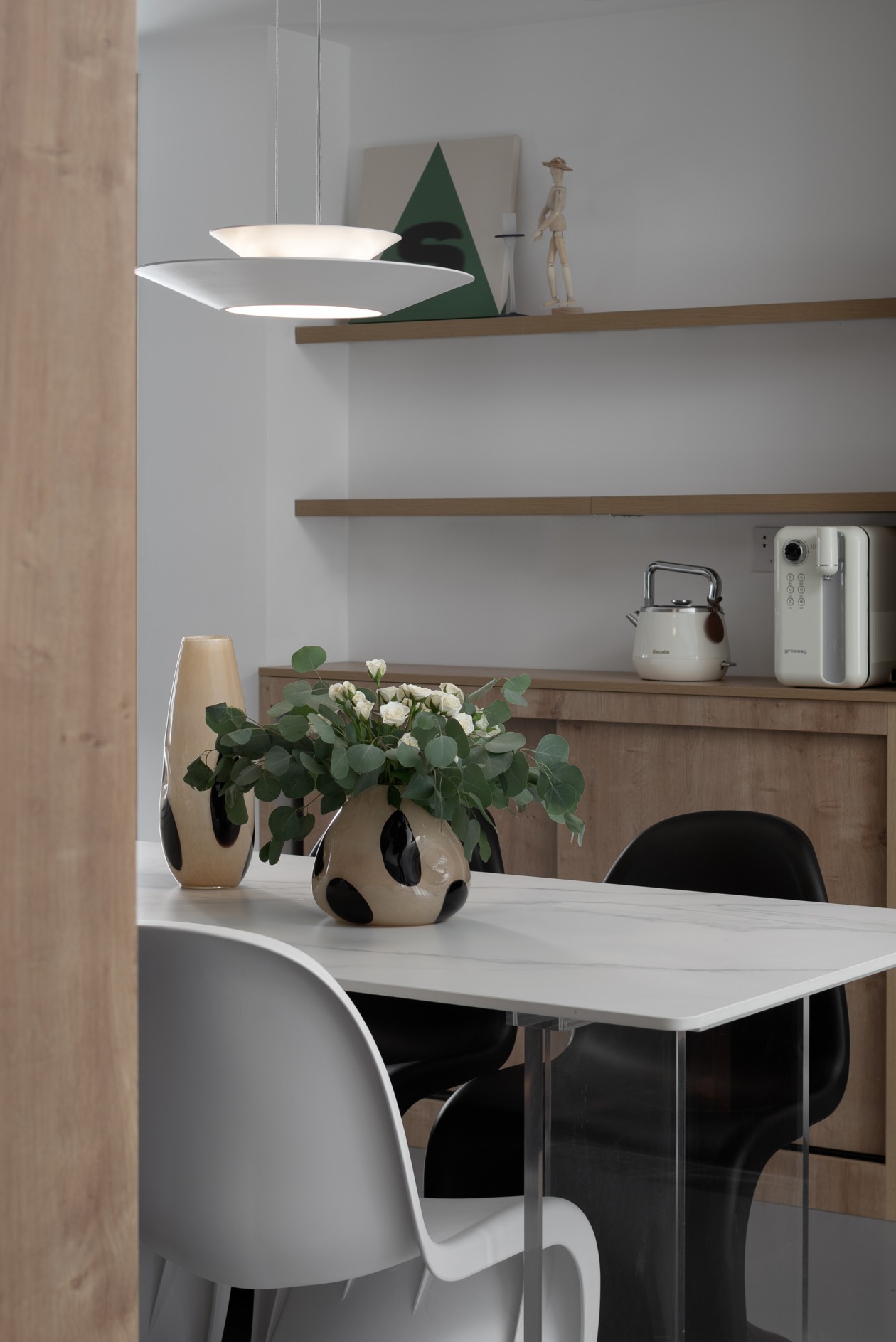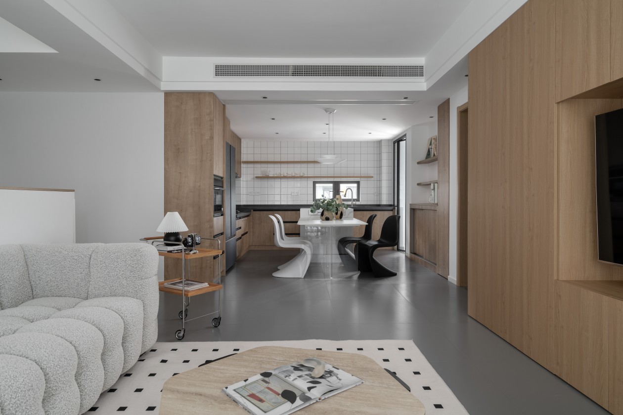 浅木柜+白瓷砖的基底干净清爽,透明餐桌+黑白一体成型椅,用“轻透感”消解了空间的紧凑感。