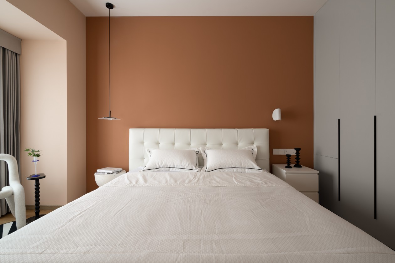 暖棕色墙面像裹了层焦糖,和白色软包床头、床品形成温柔撞色;球形壁灯的暖光一透,连空气都变得软乎乎的。
