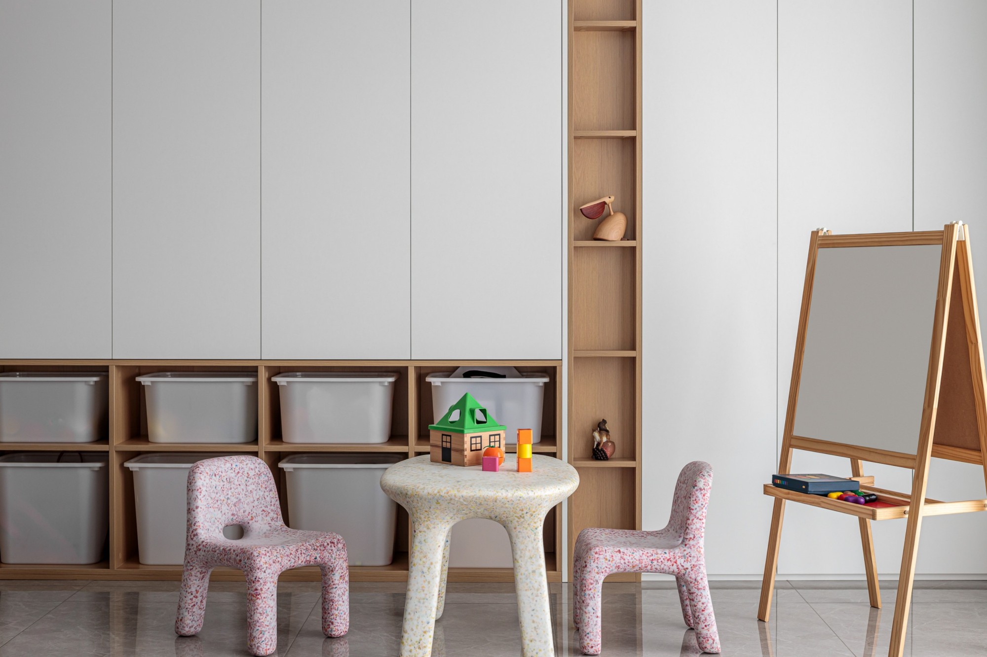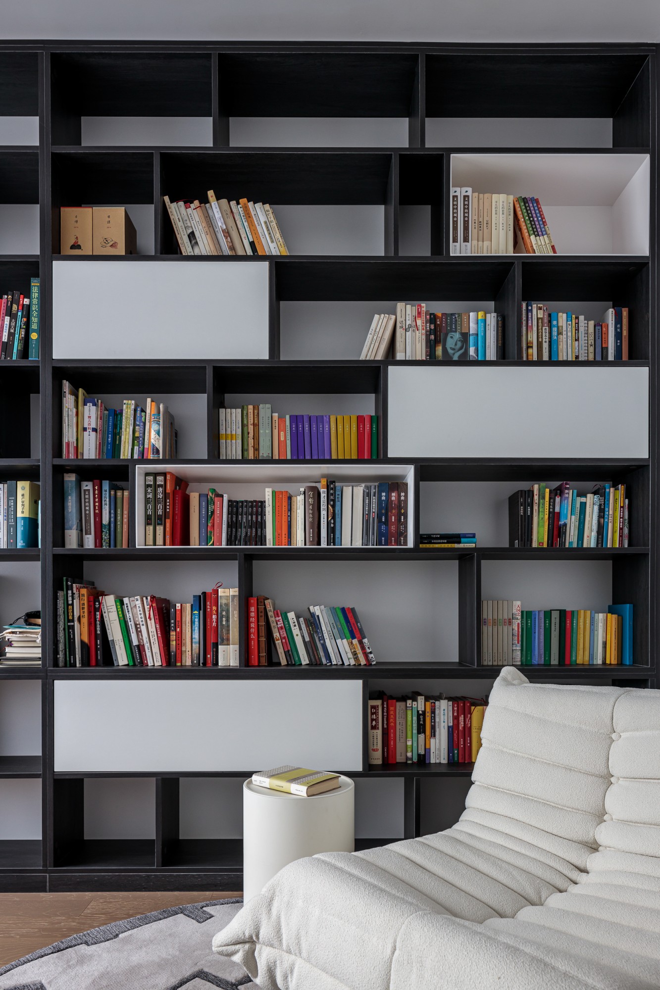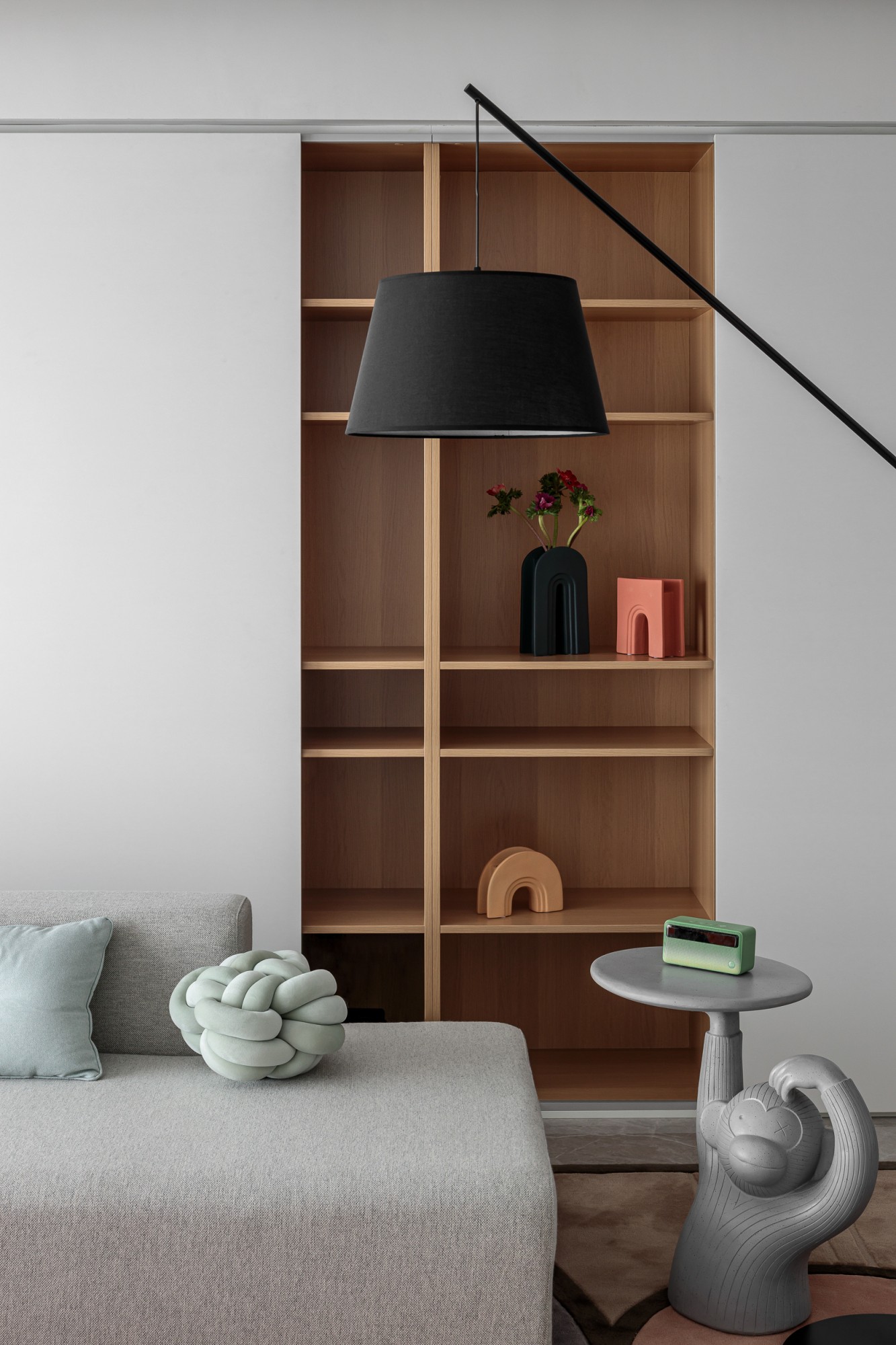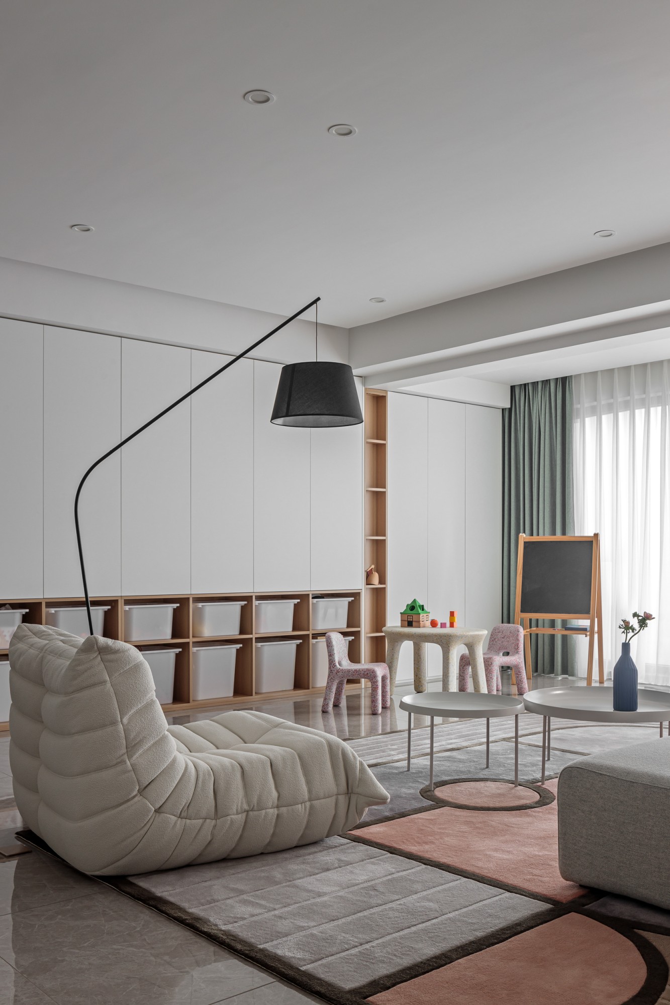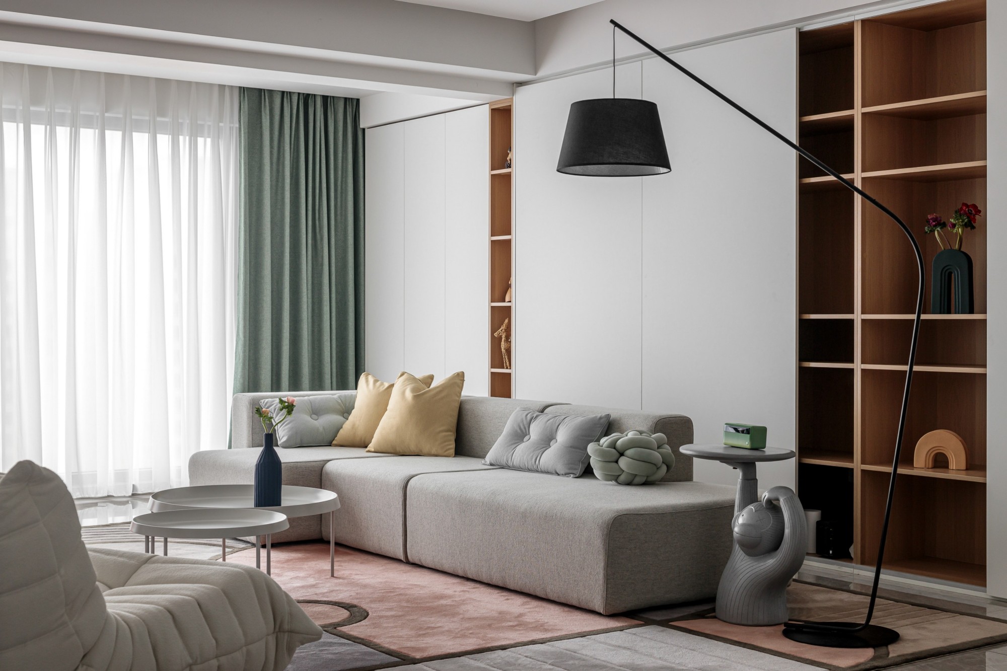 浅灰色模块沙发搭配低饱和的鹅黄、薄荷绿抱枕,像把春天的软乎乎揉进了家里~背景墙做了“隐形柜+开放格”的组合:大面积白色柜门藏起杂物,原木色开放格既能摆装饰小摆件,又能透出点温柔的暖调。地面的拼色地毯用粉棕、灰紫过渡,配上细腿圆茶几,让空间看着轻盈不笨重。黑色弧线落地灯是点睛之笔,冷硬线条中和了整体的柔和感,时髦又不抢戏。