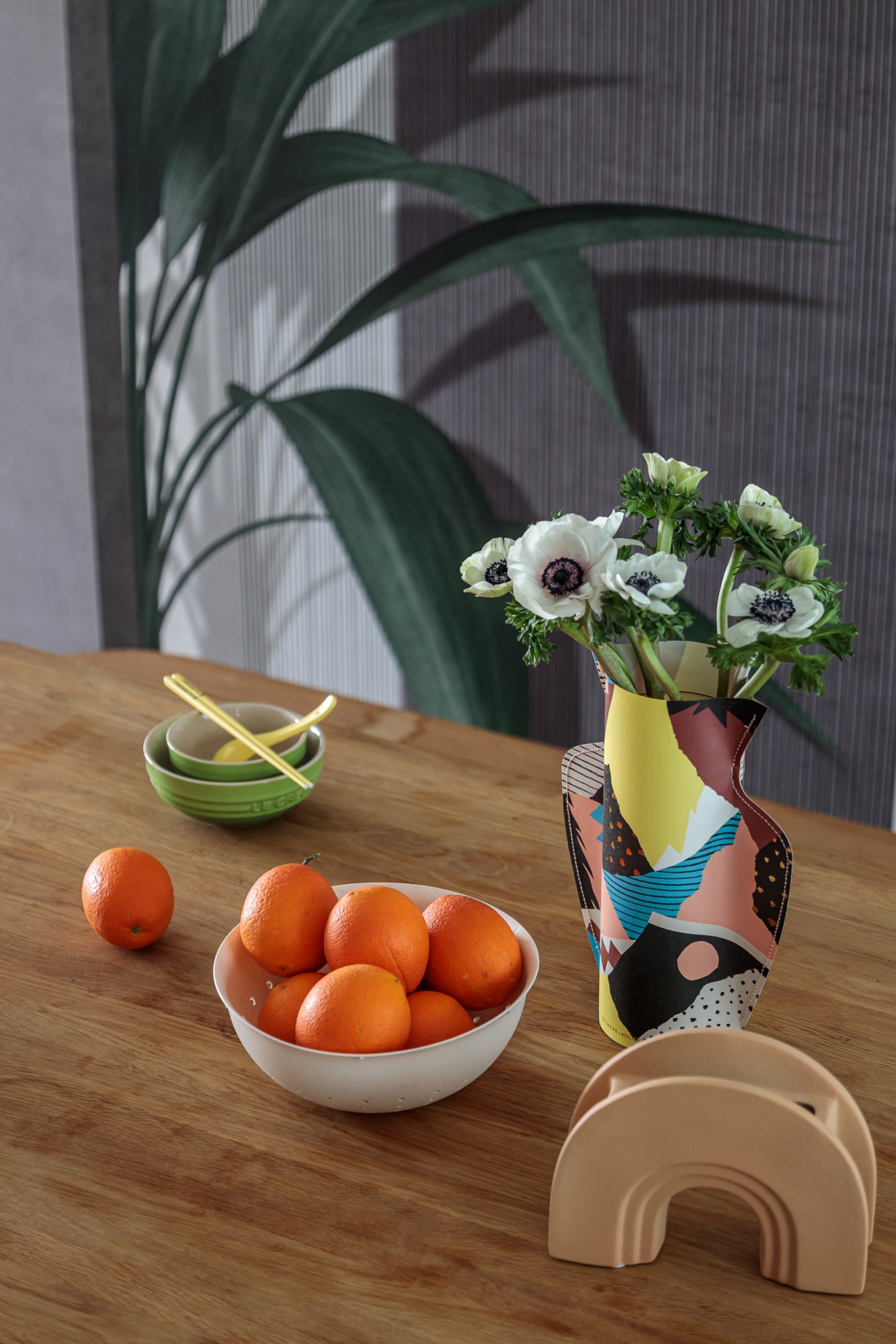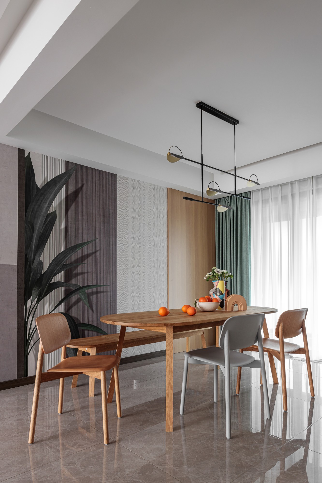 墙面用了“竖纹木饰面+肌理墙布”拼接,深浅纹理一撞,质感直接拉满。原木餐桌配半木半灰的椅子,松弛感拿捏~顶部的黑色轨道灯带点工业风,暖光打在餐桌上,吃饭都变得有氛围啦。旁边的大绿植不仅是装饰,还能给空间“透透气”,和客厅的窗帘颜色呼应,整个家的色调更连贯。