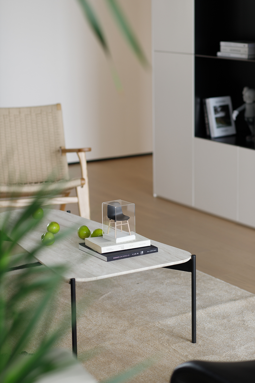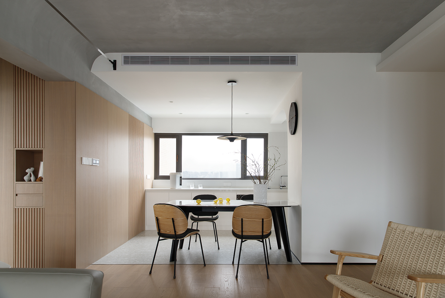 整面木饰面柜把杂物藏得严严实实,局部做了竖纹肌理,摸上去有温度,看着也不单调~餐桌选了黑框+原木椅的组合,冷调框架配暖木色,和客厅的材质刚好呼应。窗边的水吧台连咖啡机都藏好了,吃饭、备餐都在同一个空间里,动线顺得像“踩了棉花”。