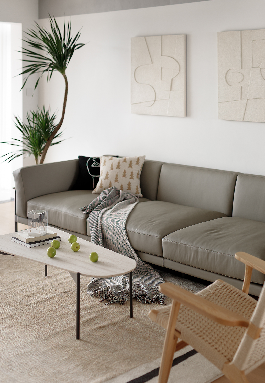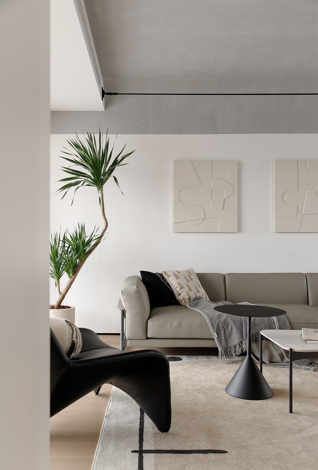 浅灰皮质沙发自带高级感,搭配藤编椅和黑色单人位,冷硬线条里混进了自然的暖调~墙面的立体肌理画是点睛之笔,素净的白墙瞬间有了层次,不用复杂装饰就很耐看。大株绿植往窗边一放,像给空间开了个“透气口”,连百叶帘透进来的光都变得柔和了,坐着发呆都舒服。