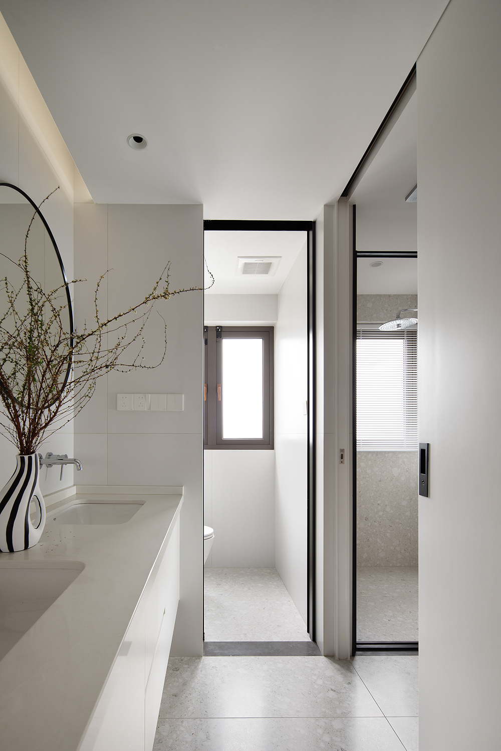 长虹玻璃隔断把卫浴分成了干湿区,透光不透人,小空间也不闷~双圆镜+悬空柜,连洗漱用品都能藏进抽屉,台面干净得能“反光”。地面选了带细闪的水泥砖,冷调里透着点细腻,连五金都用了极简款,整个空间清清爽爽,打理起来超省心。
