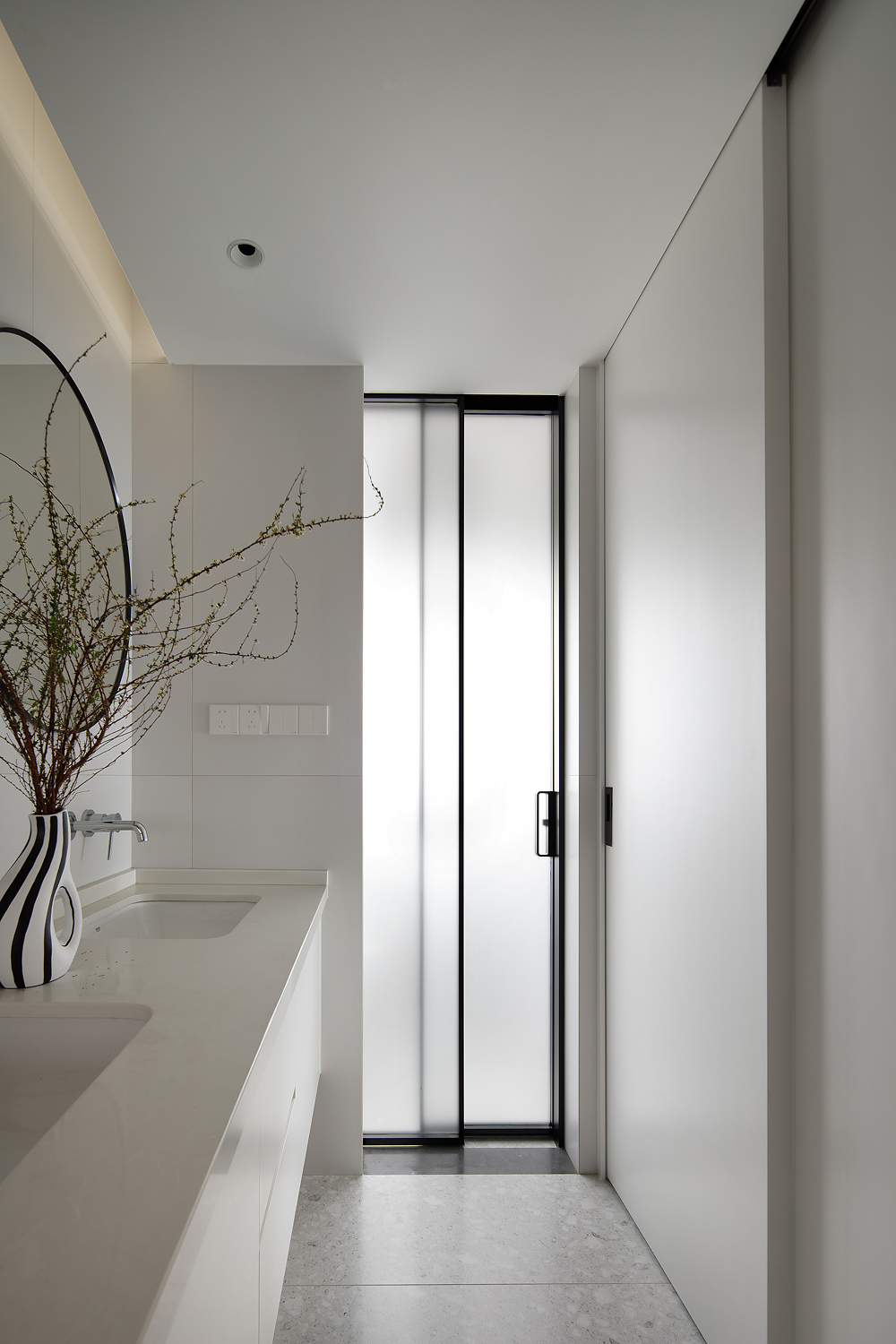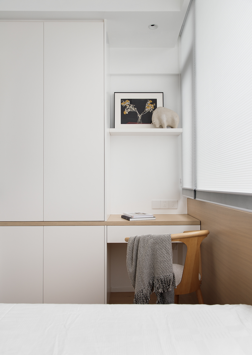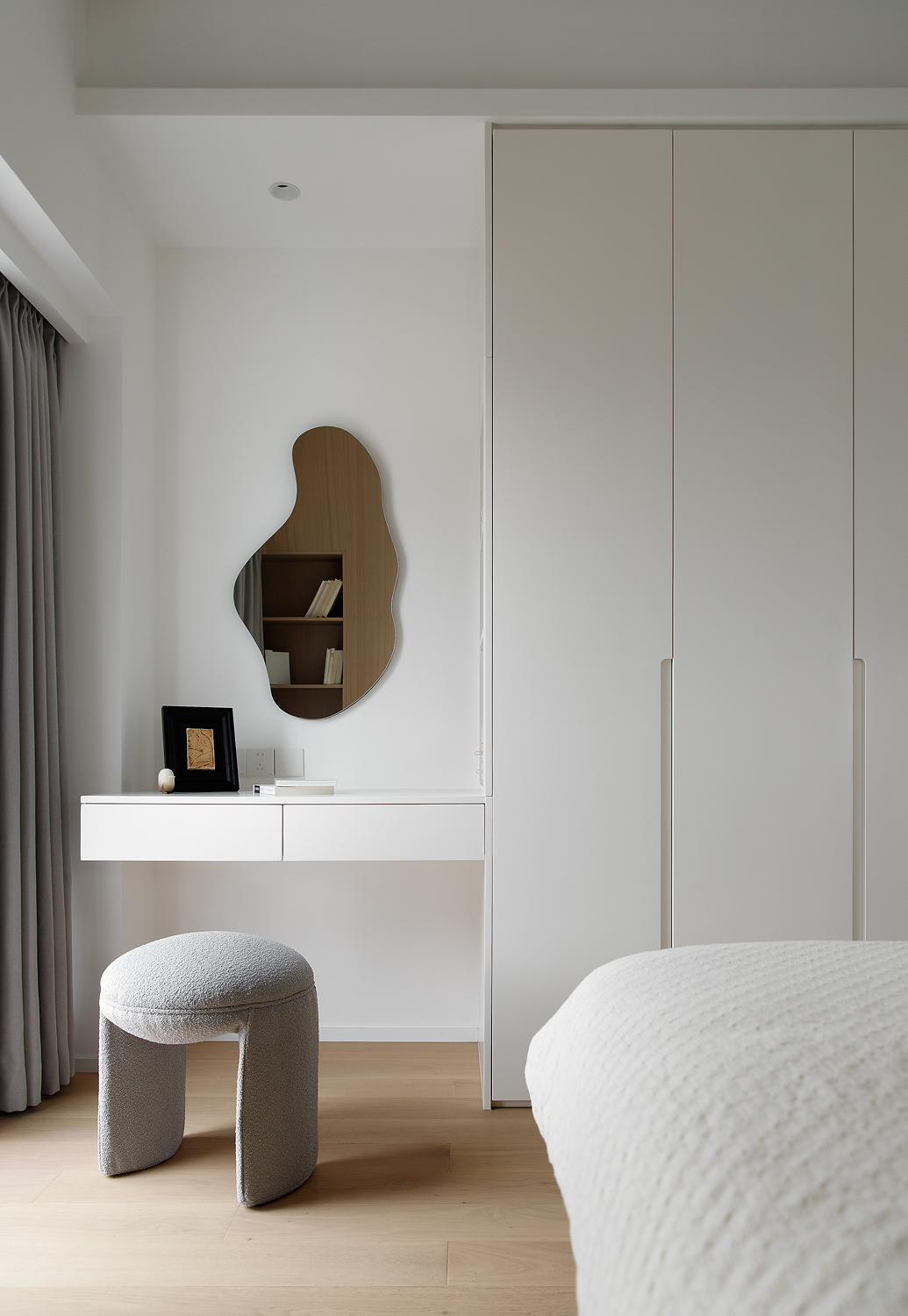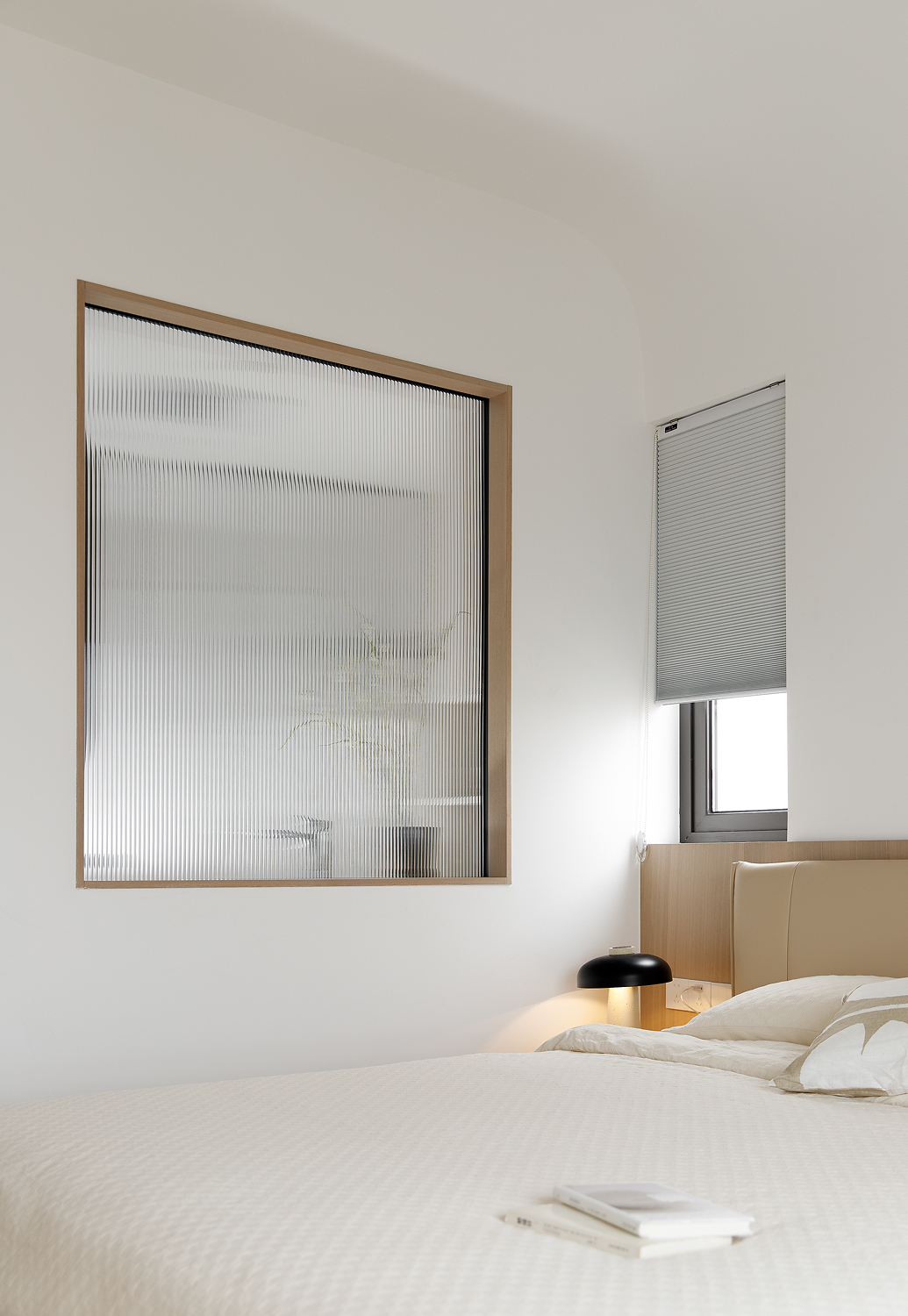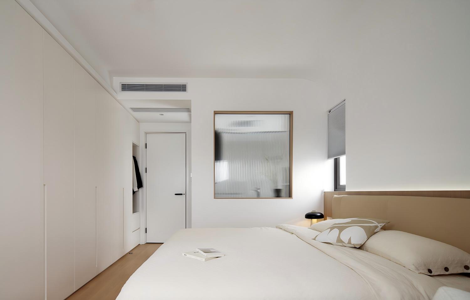 整面墙的白色衣柜把储物拉满,连门都做了隐形设计,视觉上“轻”得像没存在感~床头的木色软包自带温柔滤镜,配上素白床品,往床上一躺就像陷进了云里。墙上的长虹玻璃装饰,既能借到卫浴的光,又给素墙加了点朦胧的高级感,睡觉都变得有氛围。