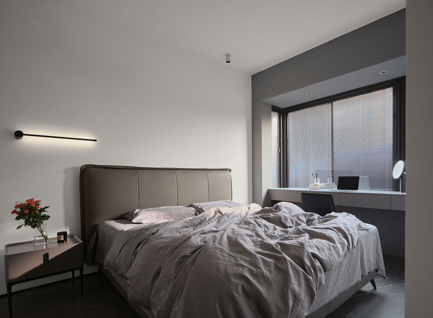 • 窗边做了悬浮书桌,既省空间又能当梳妆台,长条形壁灯代替主灯,睡前开着刚好是“不刺眼的温柔光”。