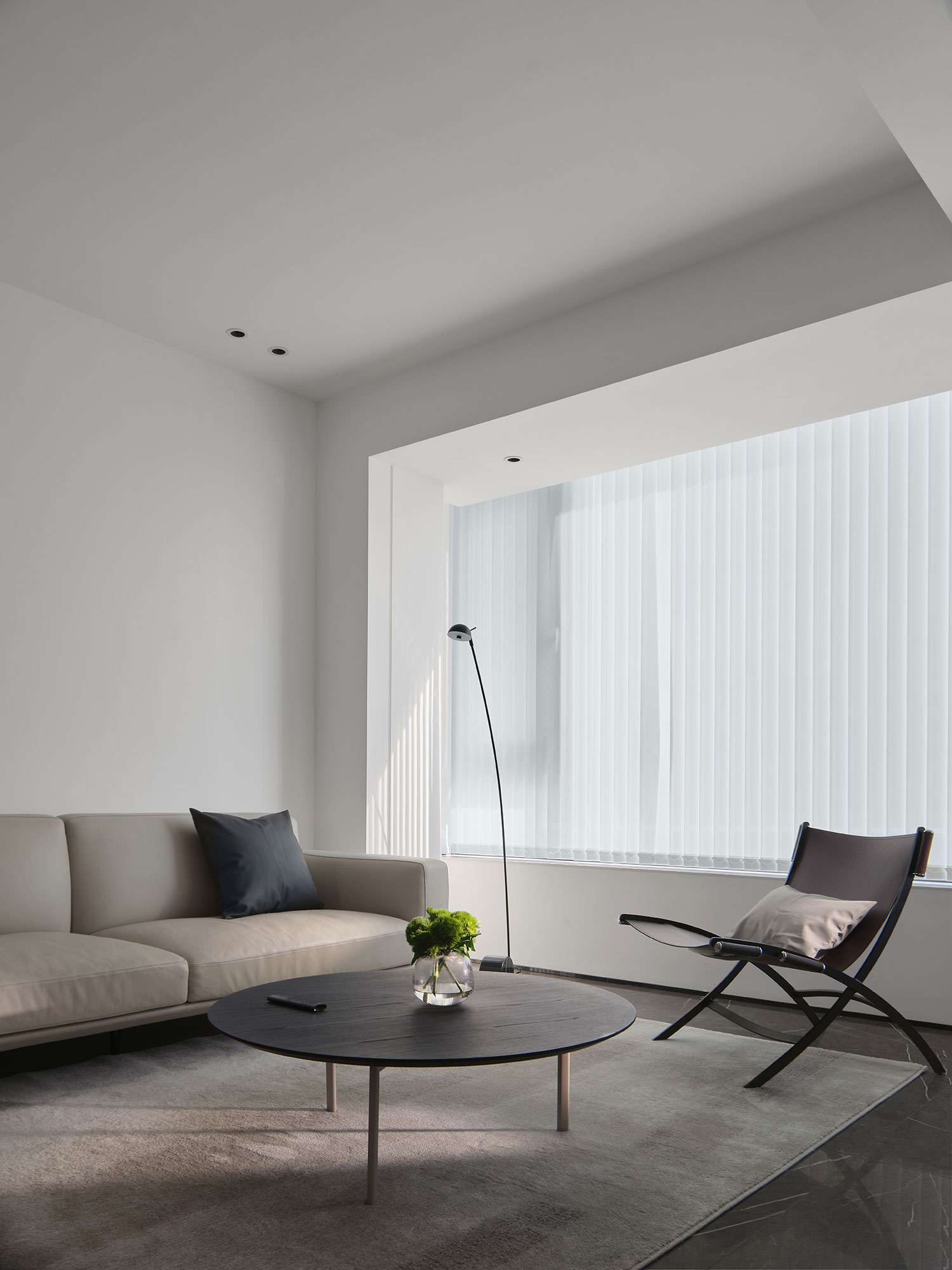 • 百叶帘是精髓:白天把光线滤成柔雾感,配上低饱和的沙发+金属边几,整个空间像“被阳光裹住的松弛感”;