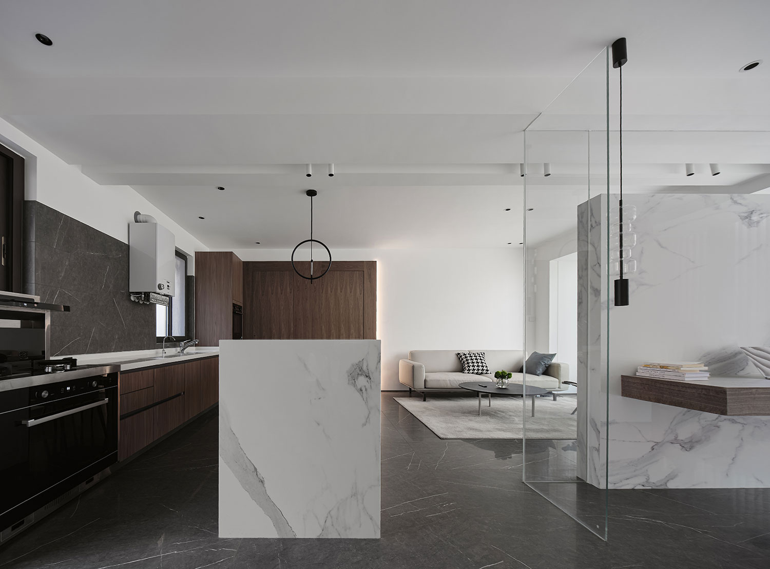 • 用玻璃+大理石岛台做隔断,既没挡住光线,又把厨房和餐厅“软划分”开;