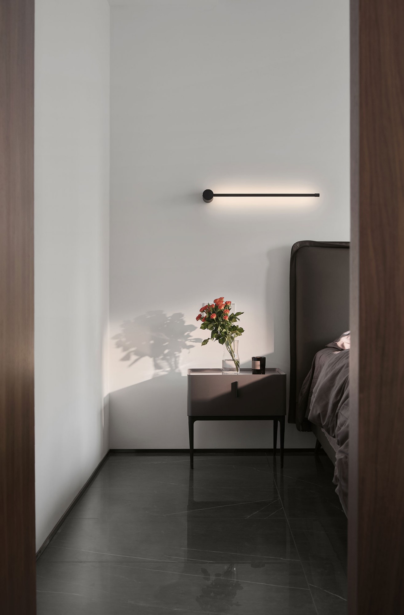 • 软包床头选了奶茶灰皮质,配上同色系床品,躺下就是“被温柔裹住”的松弛感;
