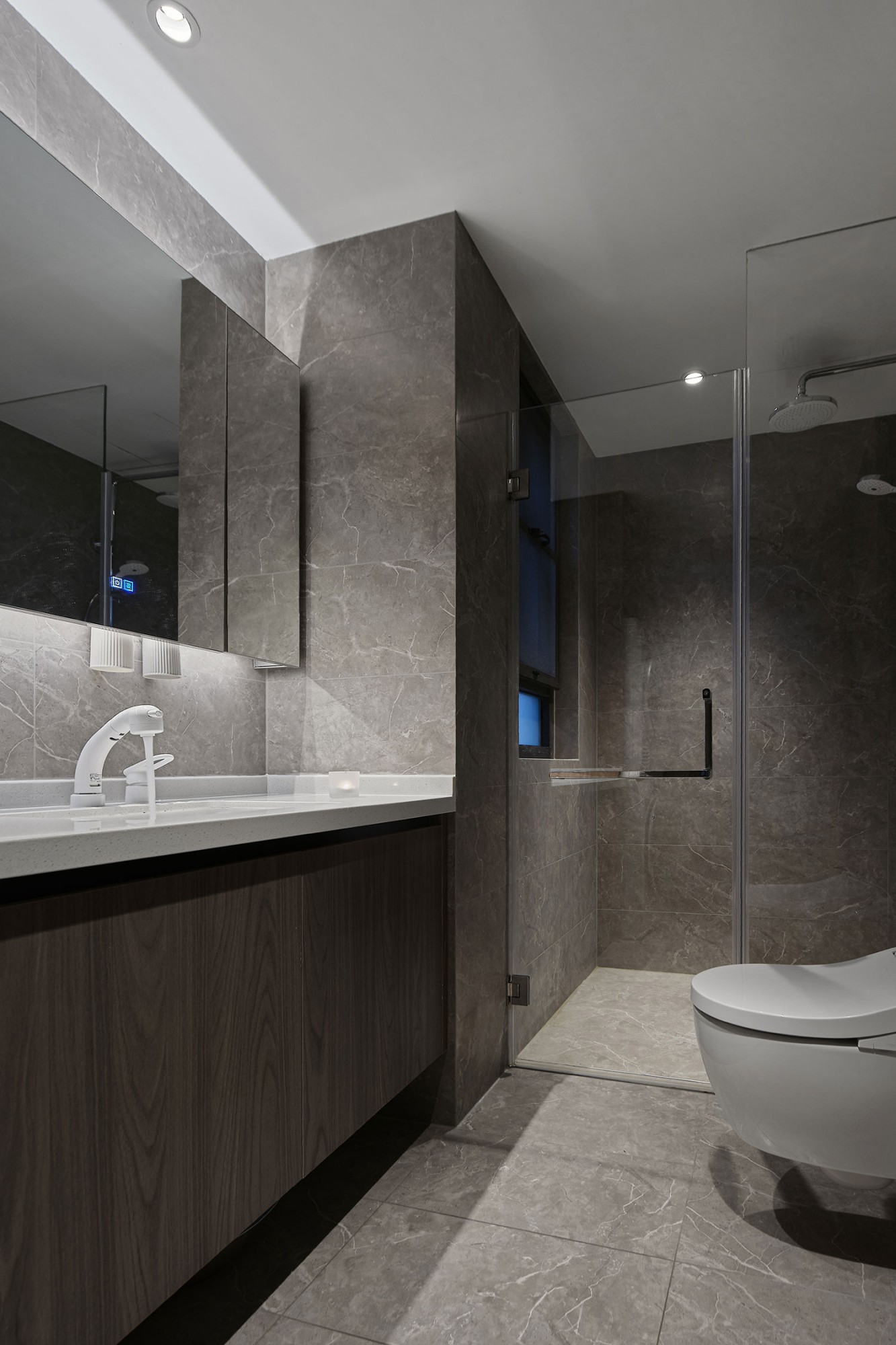 • 全空间用了同色系大理石纹砖,视觉上直接放大空间,镜柜藏了灯带,化妆时连补光都省了;
