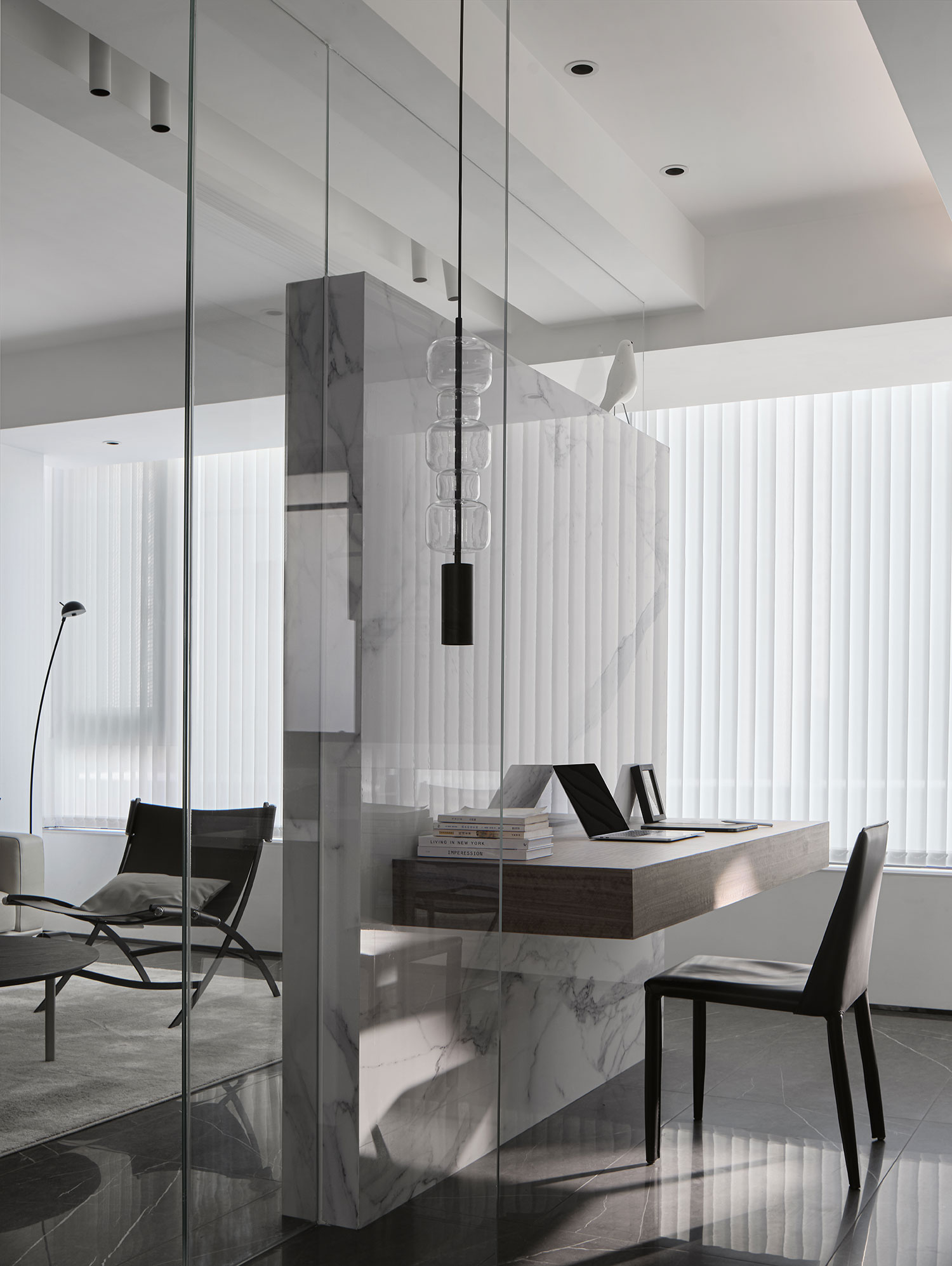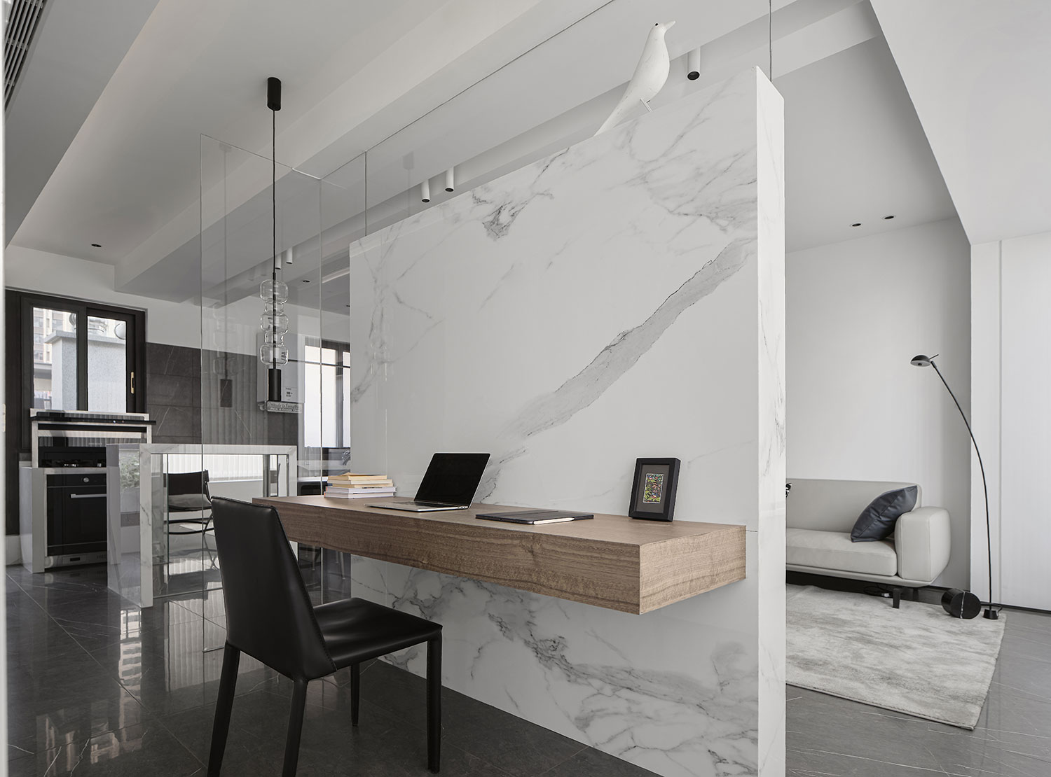 • 用大理石+玻璃做半隔断,既保证了书房的私密性,又没让空间变局促;