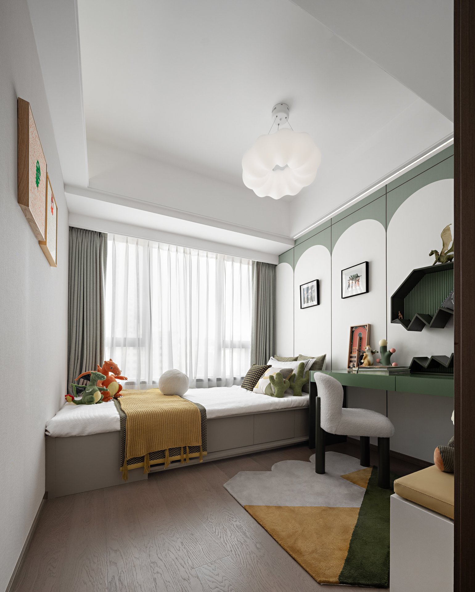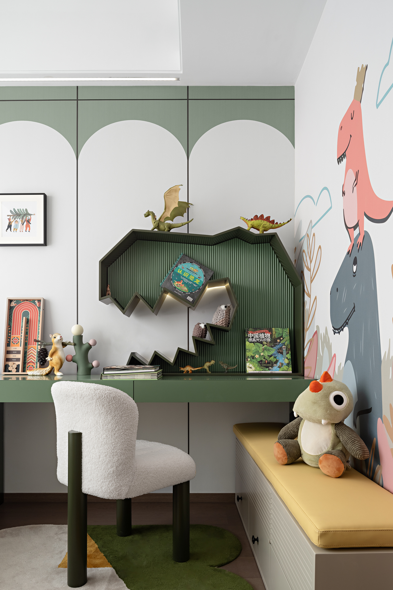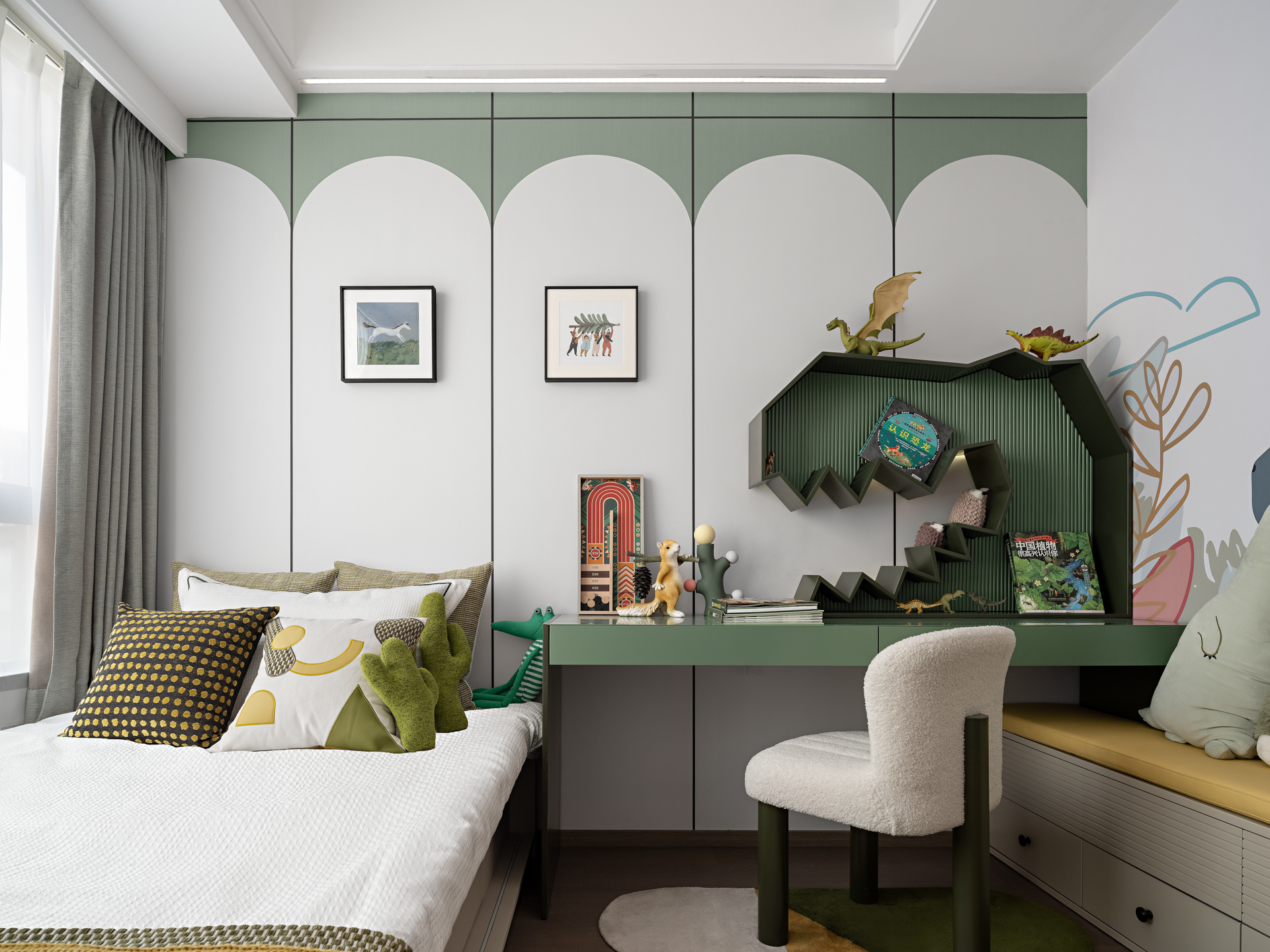 • 儿童房则是“童趣版的同色系”:圆弧墙面+恐龙书架+笑脸抱枕,把墨绿换成更活泼的浅绿,玩闹与学习的角落都藏着小心思,童趣却不杂乱。