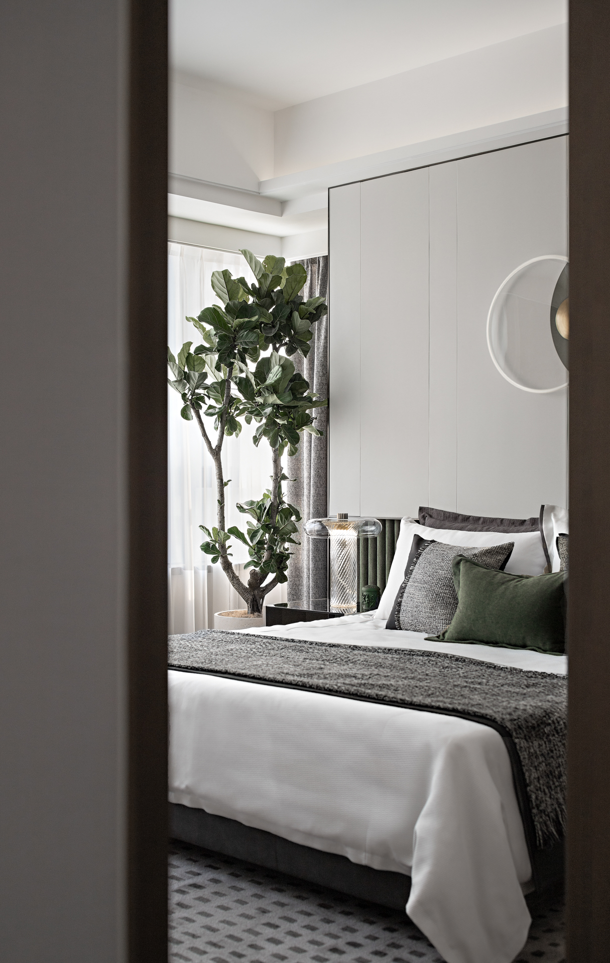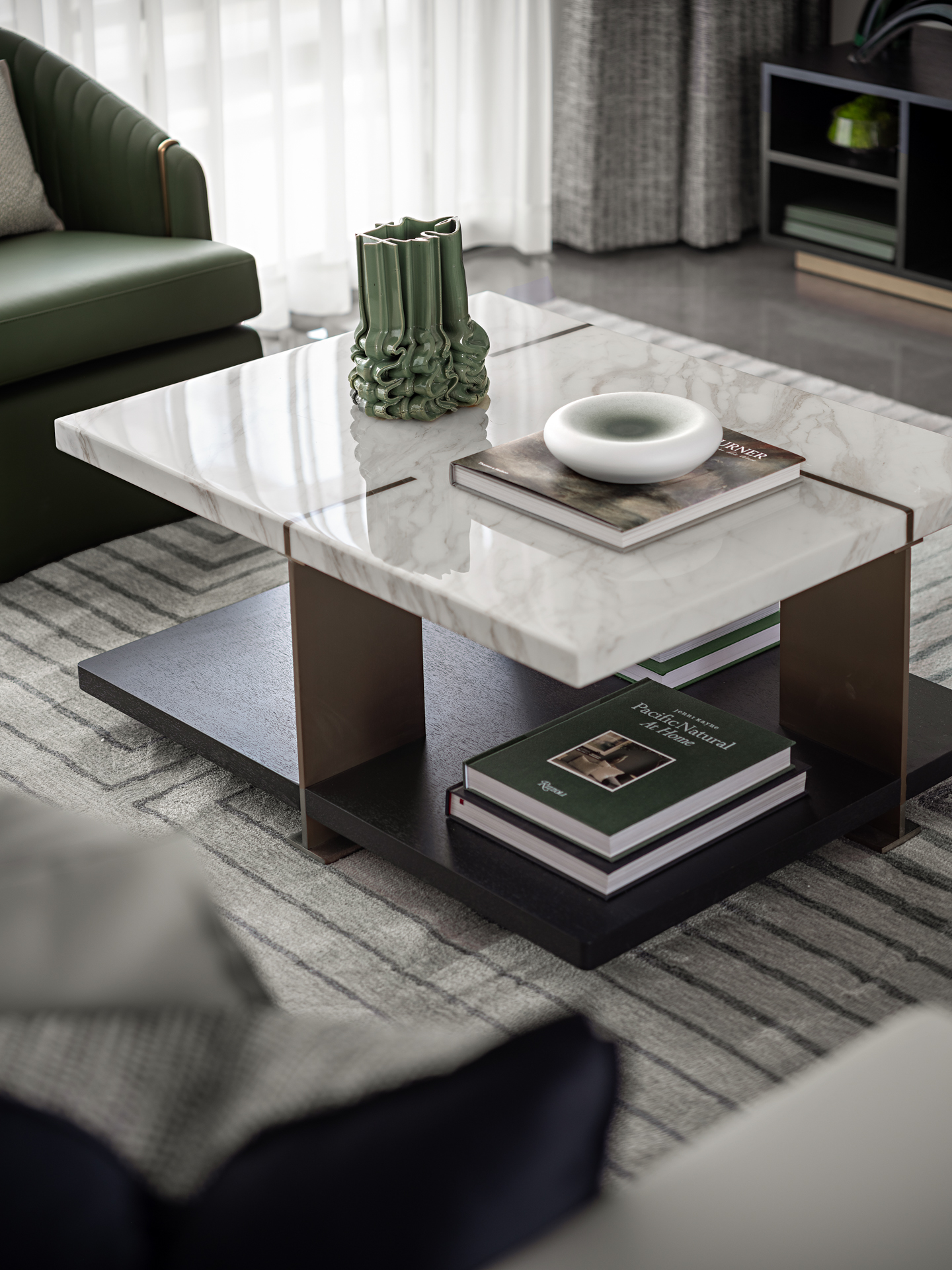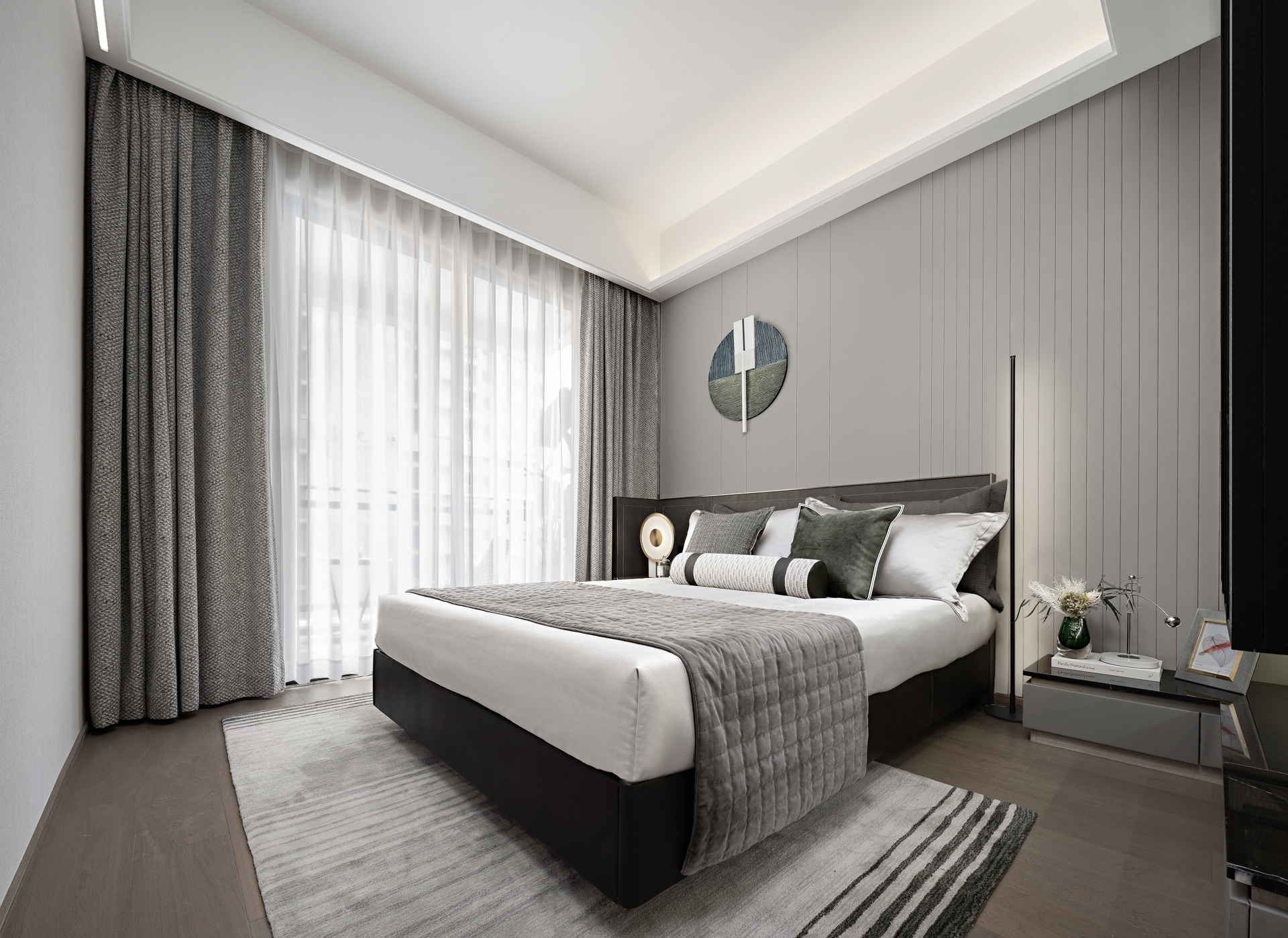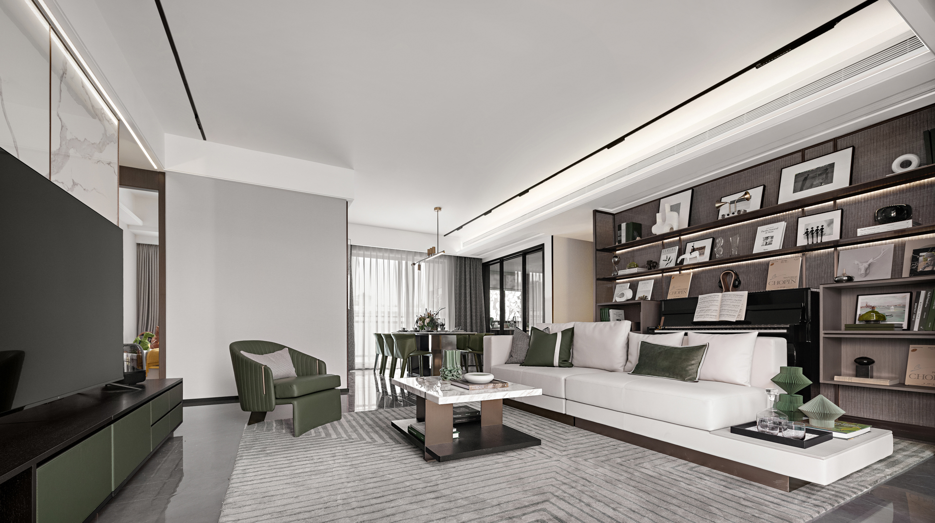 • 客厅用大理石背景墙+悬浮电视柜打底,搭配丝绒质感的墨绿单人椅,冷调的利落里藏着柔和的温度,光影透过纱帘落进来,连空气都带着松弛感;