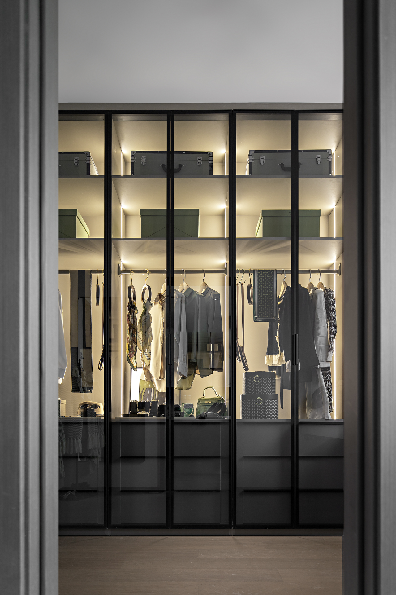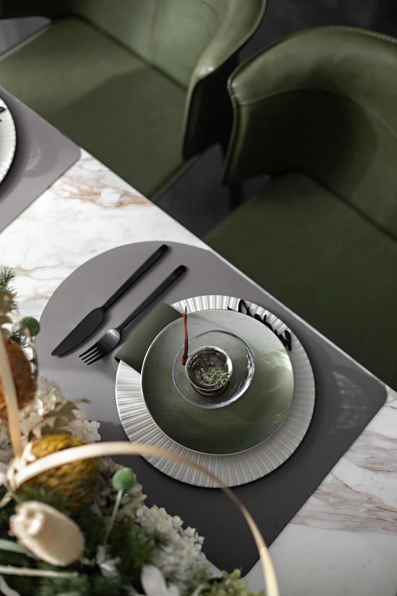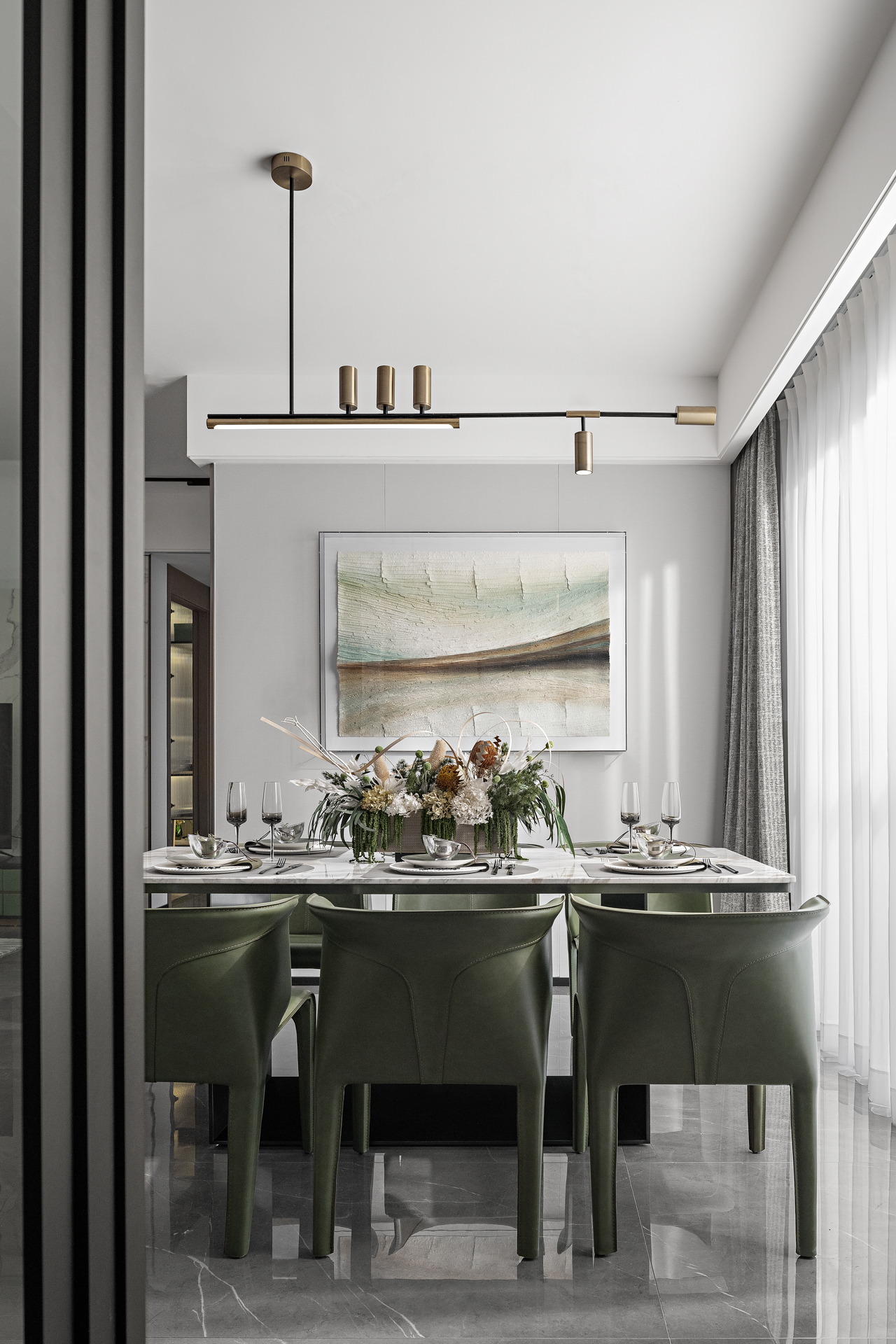 • 餐厅延续了同色系的墨绿餐椅,大理石桌面与客厅茶几呼应,黑框玻璃移门让空间通透又显层次,一盏长形吊灯轻轻勾出用餐的仪式感;