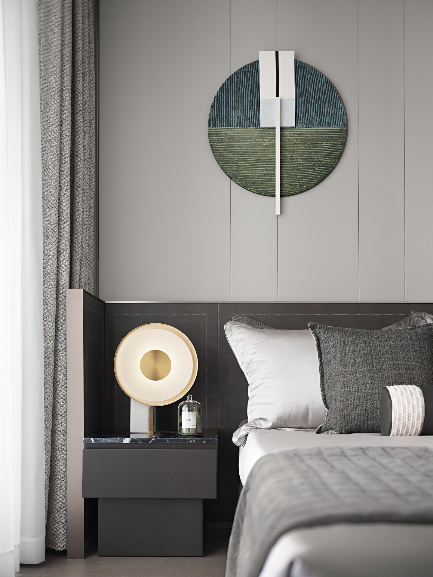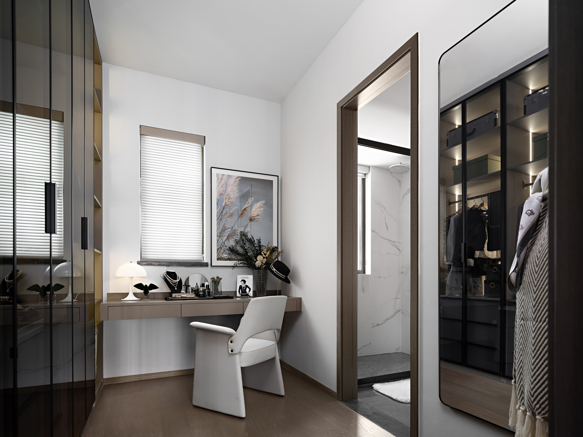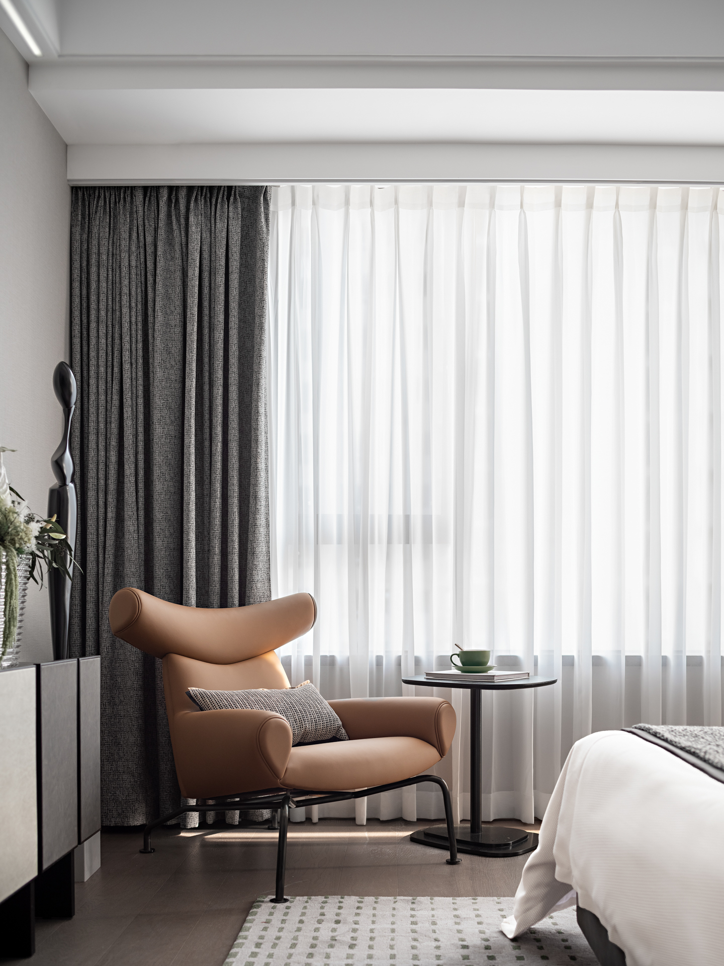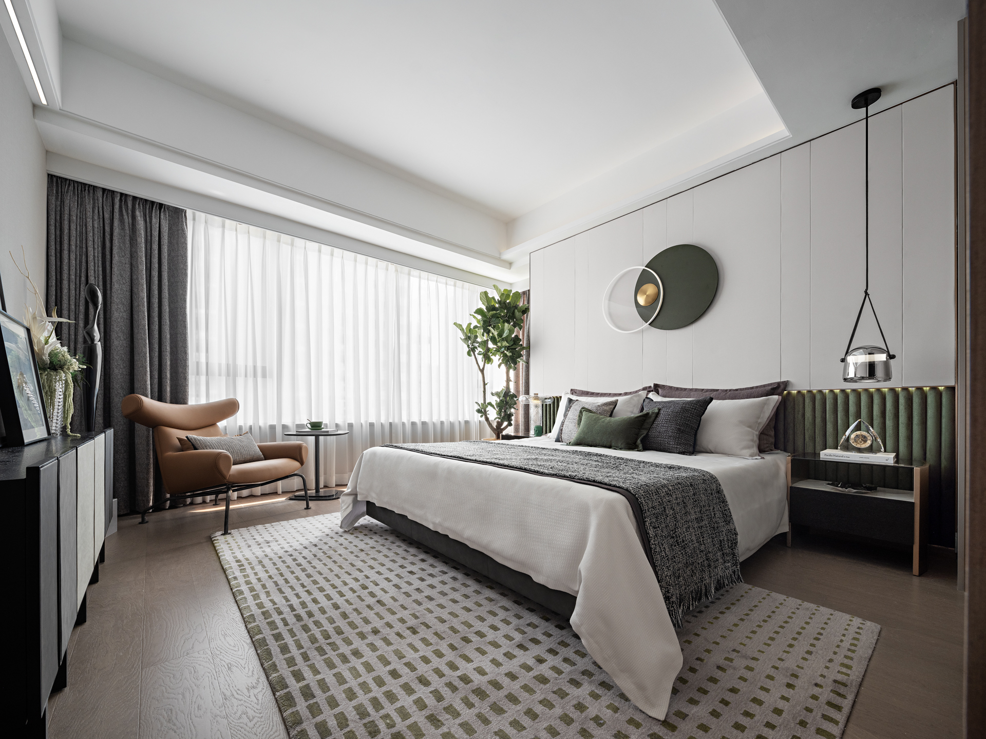 • 主卧是“安静的温柔乡”:软包床头+金属圆镜做点缀,暖棕单人椅配小边几,连植物的绿意都恰到好处,躺下就是被包裹的舒适;